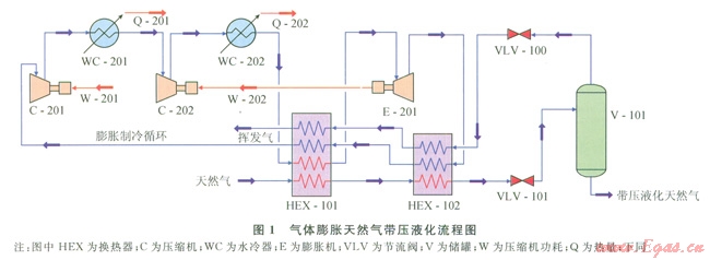 針對(duì)CO2含量較低的海上天然氣沒(méi)計(jì)了一種氣體膨脹帶壓液化流程(圖1)。為簡(jiǎn)化研究,筆者省略了天然氣脫H2S、脫重?zé)N、脫水等凈化處理過(guò)程。將凈化后帶有一定壓力的天然氣引入換熱器HEX-l01和HEX-l02降溫后節(jié)流至l~2MPa,變成液化產(chǎn)品LNG后引入儲(chǔ)罐V-101儲(chǔ)存。儲(chǔ)罐中的揮發(fā)氣(BOG)節(jié)流降溫后返同到換熱器,以回收部分低溫能和壓力能。整個(gè)液化流程由氣體膨脹制冷循環(huán)提供冷量,氣體制冷劑經(jīng)過(guò)兩級(jí)壓縮中間水冷后,再經(jīng)過(guò)換熱器HEX-l01預(yù)冷,然后經(jīng)過(guò)膨脹機(jī)膨脹降至低溫,依次為換熱器HEX-101和HEX-l02提供冷量,復(fù)溫后回到壓縮機(jī)。其中壓縮機(jī)C-202和膨脹機(jī)E-201共同構(gòu)成壓縮膨脹機(jī)組,膨脹機(jī)E-201產(chǎn)生的膨脹功剛好完全回收給壓縮機(jī)C-202使用。