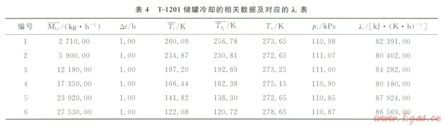 16×104m3常壓全容式混凝土頂儲罐的結(jié)構(gòu)及保溫材料都是相同的,因此,以大連LNG接收站T-1201儲罐冷卻時的數(shù)據(jù)來確定l。l同時也可作為模型的一個修正參數(shù),使所建立的模型更符合冷卻時的實際情況。表4為T-l201儲罐冷卻的相關(guān)數(shù)據(jù)及對應(yīng)的l值。