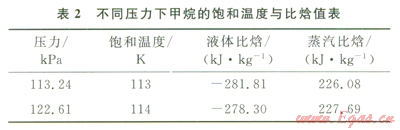 由于LNG的主要成分為甲烷,所以采用純甲烷的物性參數(shù)來確定hL和hBt[14]。而國內(nèi)常壓全容式混凝土頂儲罐的設(shè)計壓力一般為-0.50~29.O0kPa(表壓),冷卻時的壓力通??刂圃?span lang="EN-US">111.32~l21.32kPa(絕對壓力)。表2列出了不同壓力下甲烷的飽和溫度與比焓值,從表2不難看出壓力在l13.24~122.6lkPa時,蒸汽比焓的變化較小,所以取其對應(yīng)液體比焓的平均值作為hL值,即hL為-280.06kJ/kg。