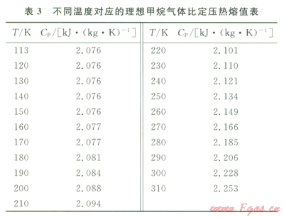 對于hBt的確定,首先通過EPCON Engineer′s Aide Toolbox 7.0軟件查詢出理想甲烷氣體不同溫度時所對應(yīng)的比定壓熱熔Cp(表3),再運用matlab擬合出Cp與T的關(guān)系函數(shù)。
