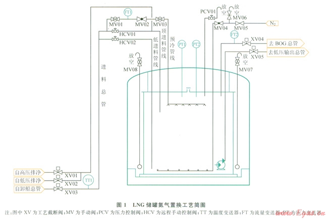 由于常溫下甲烷的密度比氮氣小,為了達(dá)到較好的置換效果,通常采用上進(jìn)下排的方式進(jìn)行氮氣置換,同時保證儲罐壓力穩(wěn)定[4]。圖l為LNG儲罐氮氣置換工藝簡圖,如圖l所示,置換用的BOG進(jìn)入進(jìn)料總管,通過頂進(jìn)料管線到達(dá)罐內(nèi),將罐內(nèi)的氮氣通過MV06閥放空排放,環(huán)隙的氮氣通過MV07和MV08閥放空排放。在氮氣置換過程中定期檢查放空處的甲烷含量,當(dāng)甲烷體積分?jǐn)?shù)達(dá)到5%時關(guān)閉放空閥門,氮氣置換完成。氮氣置換的同時,BOG會逐漸完成進(jìn)料總管的冷卻。為了避免管道和支架的應(yīng)力過大,溫降通??刂圃?span lang="EN-US">-10℃/h以內(nèi),當(dāng)進(jìn)料總管頂端溫度下降至-l00℃時,進(jìn)料總管冷卻完成。當(dāng)?shù)獨庵脫Q和進(jìn)料總管冷卻完成后,便可以對進(jìn)料總管進(jìn)行充液。