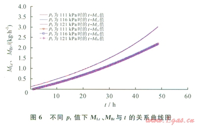 圖6為當(dāng)環(huán)境溫度為293K、儲罐冷卻初始溫度為273K、冷卻速度為-3.5K/h,儲罐壓力分別為111kPa、116kPa和121kPa時,進(jìn)入儲罐LNG流量和排出儲罐BOG流量隨時間的變化趨勢。由圖6可知,儲罐壓力的變化對進(jìn)入儲罐的LNG需求量和BOG排放量影響很小。