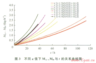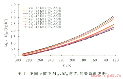由于冷卻速度不同會導(dǎo)致瞬時進(jìn)入儲罐的LNG流量和冷卻所需的LNG需求量不同,同時導(dǎo)致瞬時排出儲罐的BOG流量和冷卻過程總共排出的BOG量也不同。當(dāng)儲罐壓力為111kPa,環(huán)境溫度為293K,儲罐冷卻初始溫度為293K,冷卻速度分別為-1.5K/h、-2.5 K/h、-3.5K/h、-4.5K/h時,冷卻過程中冷卻時間(t)與LNG流量(MLt)、排放BOG流量(MBt)間的關(guān)系如圖3所示,冷卻過程中儲罐溫度(Tt)與LNG流量(MLt)、排放BOG流量(MBt)間的關(guān)系如圖4所示。