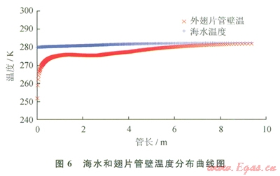 圖6給出了整個換熱管上翅片管壁和海水的溫度分布曲線。海水流量較之LNG流量大得多,所以其溫度變化不大。在1m以下的位置,管壁的溫度急劇降低,甚至低于冰點,很容易導致靠近壁面的海水結(jié)冰。該區(qū)域確實也是結(jié)冰情況較嚴重的區(qū)域。