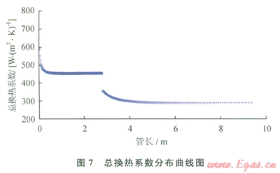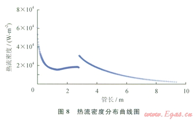 圖7、8分別給出了反映SuperORV整體換熱性能的總換熱系數(shù)和熱流密度的分布曲線??梢钥吹剑跉饣魏图訜岫芜^渡區(qū),2條曲線都出現(xiàn)了跳躍。這是由于SuperORV結(jié)構(gòu)上的變化引起的。圖7中,氣化段的總換熱系數(shù)總體優(yōu)于加熱段的總換熱系數(shù)。圖8中,加熱段開頭的熱流密度先高于氣化段末尾的熱流密度而后逐漸下降,這是由NG流體混合前后的溫度變化引起的,從氣化段出來的2個流道里的流體混合后導致溫度有大的下降,而后隨著加熱溫度又逐漸上升。