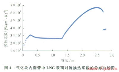 圖4給出了氣化段內(nèi)套管中LNG表面對流換熱系數(shù)的分布曲線,圖5給出了內(nèi)套管壁及其兩側(cè)流體的溫度分布曲線。從圖4可以看出,飽和沸騰區(qū)的傳熱系數(shù)有一個很大的提升,正是南于這個原因,圖5中內(nèi)套管的壁溫會有所下降,而偏向低溫流體。在缺液區(qū),圖4曲線上出現(xiàn)了較大的下降臺階,這是由擘面被蒸干所導致的傳熱性能下降而引起的,可以看到,與其對應的圖5中的內(nèi)套管壁溫也有一個明顯的上升。環(huán)狀間隙里的NG流體的溫度在0.5m之后保持在了一個較穩(wěn)定的溫度位上,這也是SuperORV利用環(huán)隙中的NG進行保溫,緩解了結(jié)冰狀況的依據(jù)。