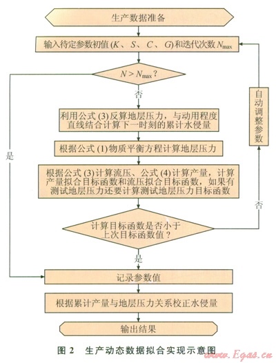 最終水侵量的確定既要通過生產(chǎn)歷史擬合結(jié)果又要通過地層壓力變化校正。這樣既考慮了水侵對(duì)地層壓力的影響,又考慮了物質(zhì)平衡方程,其實(shí)現(xiàn)框圖如圖2所示。計(jì)算步驟為:①數(shù)據(jù)準(zhǔn)備(基礎(chǔ)數(shù)據(jù)、生產(chǎn)動(dòng)態(tài)數(shù)據(jù)、試井解釋結(jié)果參數(shù))和迭代次數(shù);②確定需要擬合的待定參數(shù),假設(shè)待定參數(shù)的初始值的范圍、初始動(dòng)態(tài)地質(zhì)儲(chǔ)量,確定動(dòng)用儲(chǔ)量直線;③根據(jù)參數(shù)用式(3)計(jì)算歹;加,根據(jù)無(wú)因次壓力的定義跏反算地層壓力,根據(jù)地層壓力與累計(jì)產(chǎn)氣量關(guān)系作如圖l所示的曲線,根據(jù)視地層壓力與動(dòng)用儲(chǔ)量線的差值計(jì)算下一個(gè)時(shí)刻的累計(jì)水侵量,根據(jù)物質(zhì)平衡方程計(jì)算下一個(gè)時(shí)刻的地層壓力,根據(jù)式(3)、(4)計(jì)算流壓和產(chǎn)量,計(jì)算流壓擬合目標(biāo)函數(shù)、產(chǎn)量擬合目標(biāo)兩數(shù)及地層壓力目標(biāo)函數(shù);④判斷迭代次數(shù)是否結(jié)束,若沒結(jié)束,就與上次目標(biāo)值比較,如果比上次值小,且記錄目前參數(shù)值,如果比上次值大,重復(fù)步驟②,調(diào)整參數(shù),如果達(dá)到最佳擬合轉(zhuǎn)入步驟④;如果迭代次數(shù)完成,輸出結(jié)果。