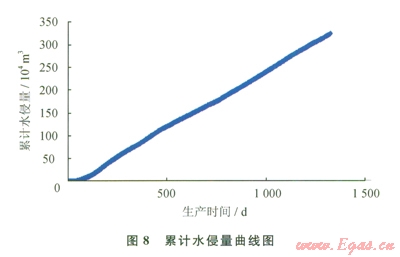 采用筆者提出的方法對(duì)該氣藏的動(dòng)態(tài)儲(chǔ)量進(jìn)行分析,首先將2口生產(chǎn)井等價(jià)為1口井,再利用實(shí)測(cè)地層壓力為約束條件,采用氣藏生產(chǎn)動(dòng)態(tài)數(shù)據(jù)進(jìn)行擬合,產(chǎn)量、壓力、累計(jì)產(chǎn)量擬合曲線如圖4~6所示,歷史擬合效果好。圖7為該氣藏的壓降關(guān)系曲線,由壓降關(guān)系式P/Z=-0.711Gp+21.661,可推出該氣藏的動(dòng)態(tài)地質(zhì)儲(chǔ)量為30.4×108m3。從圖8可以看出,目前累計(jì)水侵量達(dá)300×104m3,表明水體活躍程度高。