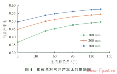 模擬研究認為孔密超過l6孔/m時,氣井產(chǎn)能增加幅度有限;相位角對產(chǎn)能的影響很明硅,作為酸壓(化)井,60°和l20°相位角比較合適,120°產(chǎn)能最高(圖4);產(chǎn)能隨孔眼深度的增加而增加,當(dāng)孔深增加到一定程度時,氣井產(chǎn)能增加的幅度明顯變緩;氣井產(chǎn)能對孔徑十分敏感,產(chǎn)能隨孔徑增大增加明顯,在孔眼穿透污染帶以后這種影響更為顯著。
