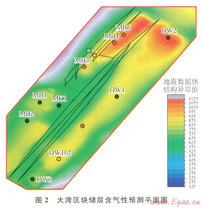 研究認為,大灣區(qū)塊存在上下兩套地震數(shù)據(jù)體結(jié)構(gòu)特征異常段,上含氣層為飛仙關(guān)組,下含氣層為長興組,主要呈北東一南西向分布。飛仙關(guān)組預(yù)測有利含氣面積49.0km2,長興組預(yù)測有利含氣面積l3.3km2,全區(qū)為62.3km2。其中DW2和MB4、MB6井區(qū)為l類有利含氣區(qū),是培育高產(chǎn)井有利區(qū)域(圖2)。