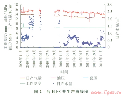 43口水平井中,有4口出水大于30m3/d(圖2),有4口出水4~l2m3/d。這些井主要分布在3~8小層,該小層共有10口開發(fā)井,有9口井出水嚴(yán)重(3口水平井和6口直井),2口井水淹停躺,氣井出水具有普遍性,且各井大量見水時(shí)間無規(guī)律。復(fù)查3~8小層測(cè)井解釋資料,結(jié)合產(chǎn)氣剖面資料,分析生產(chǎn)數(shù)據(jù),該層層內(nèi)水和邊水活躍,有潛在的水淹風(fēng)險(xiǎn)。