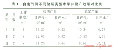臺(tái)南氣田3種不同級(jí)別產(chǎn)層的水平井,投產(chǎn)初期日產(chǎn)能力相差不大,且產(chǎn)水量較低。對(duì)比分析一段時(shí)間之后的生產(chǎn)情況,存在Ⅰ類儲(chǔ)層開發(fā)效果好于Ⅱ類,Ⅱ類儲(chǔ)層又好于Ⅲ類和Ⅱ+Ⅲ過渡類儲(chǔ)層。水平井經(jīng)過一段時(shí)間的采氣生產(chǎn),雖然產(chǎn)量變化不大,但是除Ⅰ類產(chǎn)層之外,其他低級(jí)別類型的產(chǎn)層水平井日出水量均大于1m3,說明儲(chǔ)層類型級(jí)別越低,儲(chǔ)層其泥質(zhì)含量越高、含水飽和度越大,當(dāng)目的層壓力逐步降低時(shí),束縛水變?yōu)榭蓜?dòng)水,導(dǎo)致氣井出水量增加(表1)。
