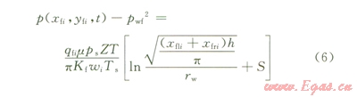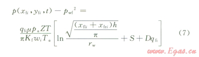 第i條裂縫就可以看成是一個(gè)以流動(dòng)半徑為Ri,厚度為裂縫寬度wi,邊界壓力為裂縫尖端壓力p(xfi,yfi,t),滲透率為Kf,流壓pwf的微型氣藏,其流動(dòng)方式可以看成徑向流,所以氣體在裂縫內(nèi)的流動(dòng)過程可表示為: