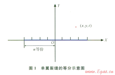 如圖l所示,將裂縫的兩翼分別分成咒單元,每一單元視為一個(gè)點(diǎn)匯進(jìn)行處理。以第j單元的中心坐標(biāo)來表示左翼裂縫上的第j個(gè)點(diǎn)匯的坐標(biāo)(x1j、y1j):