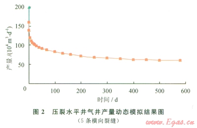 某氣藏壓裂層有效藏厚度8m,地層滲透率為10mD,地層溫度80℃,井筒半徑0.1m,水平井段長度400m;原始地層壓力27.56MPa,井底流壓為23.56MPa;氣體黏度為0.022mPa·S,氣體壓縮因子為0.957。壓裂形成5條橫向裂縫,各條裂縫長度200m,裂縫滲透率50D,支撐裂縫寬度0.003m。模擬計(jì)算結(jié)果如圖2、3所示。