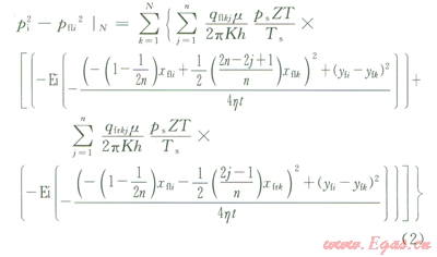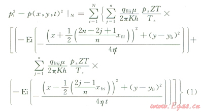 式中pi為原始地層壓力,Pa;p(x,y,t)為地層中點(diǎn)(x,y)在t時(shí)刻的壓力,Pa;qflij為第i條裂縫左端第j段的產(chǎn)量,m3/s;xfli、xfri分別為第i條裂縫左、右翼的長度,m;ps為地面標(biāo)況下的壓力,Pa;Z為偏差因子;m為氣體黏度,Pa·S;K為地層滲透率,m2;h為產(chǎn)層厚度,m;t為滲流時(shí)間,s;T為地層溫度,K;ts為地面標(biāo)準(zhǔn)溫度,K;h為導(dǎo)壓系數(shù);yfi為第i條裂縫y方向坐標(biāo)。