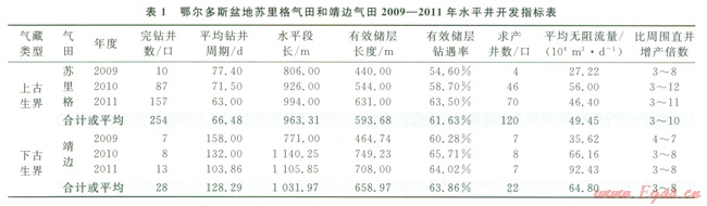 已累計完鉆的300余口水平井,主要集中于靖邊氣田和蘇里格氣田,開發(fā)層系為下古生界馬家溝組馬五,3層和上古生界下石盒子組盒8段。針對上古生界氣藏地質(zhì)特征,通過二維地震選區(qū),三維地震提高含氣砂體預(yù)測精度,骨架井鉆探落實,精細(xì)氣藏描述解剖,實現(xiàn)整體研究,整體部署,整體開發(fā),水平井有效儲層鉆遇率大幅提高(大于60%),分段壓裂技術(shù)突破10段,單井產(chǎn)量平均達(dá)到直井的3~10倍,最高達(dá)到l2倍,單支鉆井隊最高實現(xiàn)一年中開鉆6口井完鉆6口井,最短鉆井周期26.96d,最短建井周期39.67d,多口井無阻流量超過l00×104m3/a。生產(chǎn)表明,已投產(chǎn)的水平井占日開井總數(shù)4.5%,產(chǎn)出約23%的氣量,開發(fā)效果顯著(表1)。