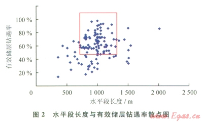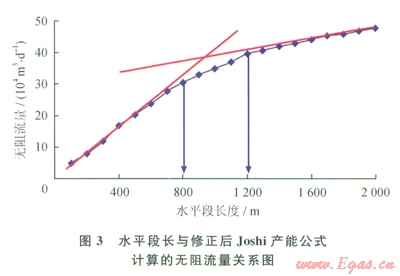 蘇里格氣田水平井開發(fā)主力層為盒8段儲層,屬辮狀河沉積,河道遷移迅速,砂體在平面上和縱向上交替疊置。統(tǒng)計結(jié)果表明,砂巖鉆遇率多在70%以上,但有效砂體規(guī)模小,連續(xù)性和連通性差,鉆遇率多數(shù)小于50%。蘇l4井區(qū)、蘇6井區(qū)及蘇l0井區(qū)進(jìn)行的加密井網(wǎng)試驗表明:有效單砂體厚度一般為2~6m,寬度400~800m,長度900~1200m,以孤立型、切割疊置型、堆、積疊置型、橫向局部連通型賦存于地層中,僅在局部疊置規(guī)模較大。通過對盒8段為目標(biāo)層的233口水平井分析表明:平均有效儲層鉆遇率僅59.91%;單層有效砂體長度小,僅l0口井l00%鉆遇有效砂體,其中7口井長度大于l000m,最長ll72m;96%井鉆遇多套砂體,泥巖段長度大于50m的有l86口。表明砂巖在空間分布不均,非均值性強(qiáng)。水平段長度、砂體長度、有效儲層長度三者正相關(guān),表明:水平段長度越長,溝通多個砂體的機(jī)率更高;在800~1200m范圍內(nèi)儲層鉆遇率高(圖2),鉆穿多套砂體的有效儲層鉆遇率明顯下降;根據(jù)對已生產(chǎn)井的動態(tài)分析,水平段長度與井控儲量、無阻流量不呈線性增長關(guān)系;應(yīng)用l6口生產(chǎn)時間較長的水平井修正了Joshi非均質(zhì)氣藏水平氣井產(chǎn)能公式,進(jìn)而進(jìn)行計算后表明,隨著水平段長度增加,無阻流量增加的幅度變緩,且在800~1200m出現(xiàn)拐點(圖3);動靜態(tài)資料證明有效砂體在單層范圍內(nèi)展布局限,水平段長度并非越長產(chǎn)量越高。