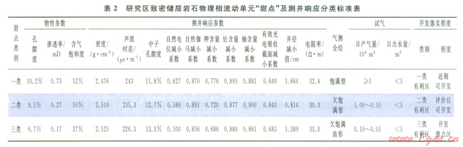 巖石物理相流動(dòng)單元“甜點(diǎn)”研究在致密儲(chǔ)層開(kāi)發(fā)中具有十分重要意義,一般致密氣層、差氣層主要富集于一、二類(lèi)流動(dòng)單元內(nèi),氣顯示層則賦存于分隔體中。研究分隔屏障的主要問(wèn)題是要在剖面上將其劃分出來(lái),即對(duì)相應(yīng)儲(chǔ)集體進(jìn)行細(xì)分巖石物理相流動(dòng)單元,并盡可能描述出最小一級(jí)分隔體。為此,在該區(qū)致密儲(chǔ)層含氣有利區(qū)分布及非均質(zhì)特征研究中,精細(xì)地表征儲(chǔ)層性質(zhì)、分布及其對(duì)天然氣滲流的影響,結(jié)合巖石物理相流動(dòng)單元“甜點(diǎn)”儲(chǔ)層特征與測(cè)井響應(yīng)(含氣測(cè)全烴)特征,把該區(qū)巖石物理相流動(dòng)單元“甜點(diǎn)”劃分為一、二、三類(lèi),即按滲流、儲(chǔ)集和含氣“甜點(diǎn)”控制能力及測(cè)井響應(yīng)特征分為近期可開(kāi)發(fā)(一類(lèi))、評(píng)價(jià)后可開(kāi)發(fā)(二類(lèi))及勘探開(kāi)發(fā)潛力區(qū)(三類(lèi))等三類(lèi)含氣有利區(qū)(表2)。