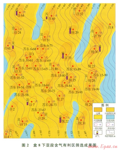 該層段一、二類(lèi)巖石物理相“甜點(diǎn)”分布相對(duì)密集,主要呈大小不勻彎曲短條帶、串珠狀或豆莢狀分布發(fā)育。它們平面上因縱向砂體多期疊置,砂體橫向連片性較好,總體在平面上由西向東構(gòu)成一系列規(guī)模相對(duì)較大“甜點(diǎn)”范圍,形成30個(gè)一、二類(lèi)含氣有利區(qū),一般寬度為1000~2000m,長(zhǎng)度為2000~4000m。它們分別處于中粗粒石英砂巖的心灘微相中,沉積中水淺水動(dòng)力作用強(qiáng),巖性粗、流體滲流較好;成巖中抗壓實(shí)作用強(qiáng),且硅質(zhì)膠結(jié)弱,易于保存孔隙;廣覆式生氣提供了最大泄氣面積;穩(wěn)定的構(gòu)造背景、砂巖致密性、非均質(zhì)性有利于氣藏聚集保存。因而,該層段辮狀河含氣有利區(qū)具有明顯較好的沉積、成巖作用特征和成藏綜合控制因素條件。特別值得注意的該層段辮狀河道間發(fā)育一定規(guī)模分流堤岸對(duì)河道砂的封堵和分隔作用,同一“甜點(diǎn)”范圍疊置可形成不同的獨(dú)立氣藏,多個(gè)河道“甜點(diǎn)”范圍疊置可形成多個(gè)相對(duì)獨(dú)立氣藏并存,它們都為該區(qū)氣田區(qū)塊部署滾動(dòng)開(kāi)發(fā)井和開(kāi)發(fā)準(zhǔn)備井提供有利目標(biāo)和井區(qū)(圖2)。