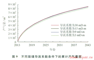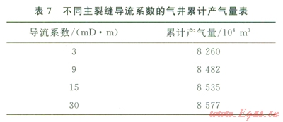 體積壓裂形成的裂縫體系是否具有經(jīng)濟效益,一個很重要的指標是裂縫的導流能力,因此頁巖氣藏的開發(fā)不僅僅依靠復(fù)雜的裂縫網(wǎng)絡(luò)系統(tǒng),還需要裂縫有充分的導流能力。圖9展示了不同裂縫導流系數(shù)條件下的累計產(chǎn)氣量對比情況,表7中給出了具體的累計產(chǎn)氣量,從該圖9和表7中的數(shù)據(jù)可以看出主裂縫導流系數(shù)對模型的采出程度有較大影響,在其他條件都相同時,提高壓裂形成主裂縫的導流能力,可明顯提高頁巖氣藏的采收率。這里需要指出的是,雖然增大裂縫的導流系數(shù),是提高采收率的途徑之一,但從圖9中可以看出,隨著導流系數(shù)的不斷增大,累計采氣量的增幅越來越小,對于本文中的數(shù)值模型,當裂縫導流系數(shù)達到9mD·m后,進一步增加裂縫的導流能力并不能顯著地提高氣藏的采出程度。