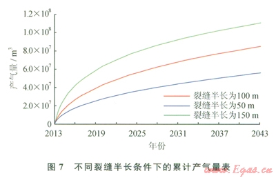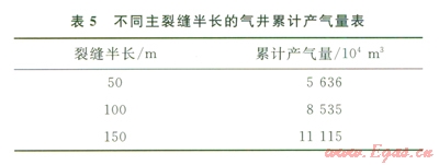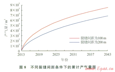 頁巖儲層的體積壓裂改造,通過多方向人丁縫裂溝通更多的天然裂縫,增加泄流面積。圖7和圖8分別模擬了不同裂縫半長和不同裂縫間距條件下的單井模型累計產(chǎn)氣量的對比情況,表5和表6分別給出了具體的累計產(chǎn)氣量。結(jié)合圖7和表5、圖8和表6可以看出,當體積壓裂形成的主裂縫較短或分段壓裂的級數(shù)較少時,增加主裂縫的長度和分段壓裂的級數(shù)都可以使累計產(chǎn)氣量顯著提高。但從模擬結(jié)果來看,當裂縫半長超過l00m后,再繼續(xù)增加裂縫的長度,累計產(chǎn)氣量的增幅越來越小,同樣隨著分段壓裂級數(shù)的增加,累計產(chǎn)氣量的增幅也是越來越小的。