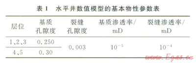 筆者采用Eclipse2010.1軟件的煤層氣(CBM)模型,應(yīng)用塊中心網(wǎng)格建立網(wǎng)格模型,如圖l所示。模擬工區(qū)的長×寬×高為:l860m×797m×100m,采用不等間距網(wǎng)格:x方向的網(wǎng)格大小為0.03~80m,y方向的網(wǎng)格大小為6~40m,z方向5套基質(zhì)和裂縫組合的厚度均為20m,凈毛比為0.4,模型的網(wǎng)格節(jié)點為:l29×41×10=52890。模擬井水平段長為1100m,水平段共壓裂10段,設(shè)計裂縫半長均為l00m,主裂縫寬度采用最小步長,即假設(shè)主裂縫寬度為0.03m。模型的頂深2500m,氣水界面2700m,壓力系數(shù)2.0,假定氣體組分均為C1,每層的基本物性參數(shù)如表1所示。
