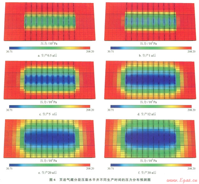 頁巖儲層的滲透率極低,一般都要經(jīng)過大規(guī)模體積壓裂,在氣井周圍形成復(fù)雜的裂縫網(wǎng)絡(luò)體系,頁巖氣井才能獲得工業(yè)氣流。圖6展示了上述模型中分段壓裂水平井生產(chǎn)不同時間后的壓力分布情況,在分段壓裂水平井投產(chǎn)初期,首先采出的是壓裂形成的主裂縫中的游離氣,進而采出整個儲層改造區(qū)域(SRV)內(nèi)的游離氣,當生產(chǎn)1a左右時間后,壓力波及廠SRV區(qū)域的邊緣。在此之前一直是體積壓裂改造形成的裂縫網(wǎng)絡(luò)系統(tǒng)向氣井供氣,因此氣井的產(chǎn)量遞減迅速,這與圖4中的產(chǎn)量遞減現(xiàn)象是相吻合的。隨著生產(chǎn)時間,氣井形成的壓降漏斗隨之增大(圖6),儲層未被改造到的區(qū)域開始向氣井供氣,隨著游離氣的逐漸采出,儲層中壓力降低,吸附氣開始解吸附(圖5)。頁巖氣井后期的產(chǎn)量雖然較低,但是相對穩(wěn)定。從圖6-d~f中大致可以看出,當氣井生產(chǎn)足夠長時間后,壓力波及范圍已基本不變,單井控制范圍較小,只能靠增加水平井的數(shù)量來提高整個氣藏的采出程度。