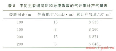 根據(jù)上述分析,只有壓裂縫具有一定的導流能力時,才可能成為對氣藏開發(fā)有效的裂縫,而且壓裂縫的導流能力越強,裂縫周圍儲層中的流體就越容易往裂縫中流動,進而流入井筒中,因此裂縫導流能力的強弱對于分段壓裂的級數(shù)具有重要影響。如果能夠壓裂出相對高導流能力的裂縫,那么高導流裂縫之間間距的影響就會減小。相反,如果不能壓裂出相對高導流裂縫,則通過增加壓裂的級數(shù)來減小主要的高導流裂縫間的間距也會本質(zhì)上提高產(chǎn)氣速率和氣藏采收率(圖10、表8)。另外,相對高導流能力的裂縫,不僅可以大幅度的提高產(chǎn)量,還可以減少壓裂的級數(shù),減少成本,提高開采的效益。