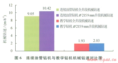 2)連續(xù)油管的Æ215.9mm井眼段鉆進(jìn),進(jìn)尺為285.74m,純鉆時(shí)間為27.40h,機(jī)械鉆速為l0.42m/h。而采用宏華2號教學(xué)鉆機(jī)鉆的Æ215.9mm井眼段平均機(jī)械鉆速僅為2.03m/h。因此在Æ215.9mm井眼的鉆進(jìn)中,連續(xù)油管鉆機(jī)的機(jī)械鉆速是教學(xué)鉆機(jī)機(jī)械鉆速的5.1倍(圖6)。