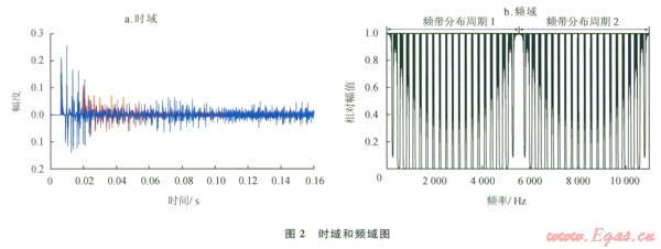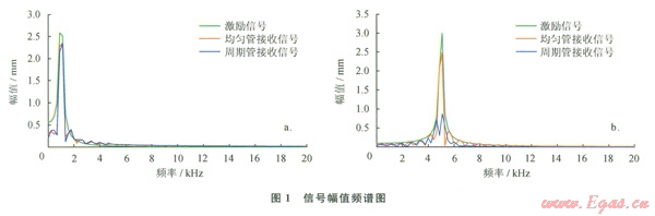 激勵(lì)波形為正弦波,單根鉆桿的截面積為24.5cm2,長度為9.14m,單個(gè)接頭的截面積為l30cm2,長度為0.46m,均勻圓管的截面積為24.5cm2,彈性模量(E)為206GPa,密度(ρ)為7890kg/m3。進(jìn)行有限元瞬態(tài)分析,提取激勵(lì)信號和距離激勵(lì)位置19.2m處接收信號,所得l000Hz和5000 Hz結(jié)果數(shù)據(jù)(圖1-a、b),可知周期管較均勻管接收信號畸變程度嚴(yán)重,隨著頻率增大波形失真程度增大。利用有限差分法進(jìn)行瞬態(tài)分析,得到時(shí)域和頻域圖(圖2-a、b),可知結(jié)構(gòu)的幾何尺寸決定了通頻帶的分布特征,使得通頻帶分布呈現(xiàn)出交替出現(xiàn)的梳狀濾波器結(jié)構(gòu)特性。依據(jù)前期理論和實(shí)驗(yàn)研究[15-18],結(jié)合聲速