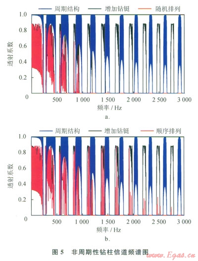 選擇300根鉆桿和300個(gè)接頭組成周期性結(jié)構(gòu)進(jìn)行分析,材料密度為7890kg/m3,聲速為5100 m/s,單根鉆桿的截面積為24.5m2,長度為9.14m,單個(gè)接頭的截面積為130m2,長度為0.46m。分析得到3000Hz以內(nèi)的頻域特性如圖5所示;對上述周期性鉆柱結(jié)構(gòu)增加l0根鉆鋌,單根鉆鋌的截面積為165m2,長度為9.15m,分析結(jié)果如圖5中所示,可知與周期性結(jié)構(gòu)相比較,其頻帶分布有顯著變化,透射幅值減小;將結(jié)構(gòu)中的單一尺寸鉆桿改變?yōu)橛?span lang="EN-US">6種鉆桿尺寸組成的結(jié)構(gòu),每種尺寸鉆桿數(shù)目分別為50根,幾何尺寸如表l所示,排列方式采用隨機(jī)排列方式,分析結(jié)果如圖5-a中所示,可知長度差異增大將使得通頻帶結(jié)構(gòu)發(fā)生顯著變化,在一個(gè)頻帶周期的中間出現(xiàn)完全的阻帶;依據(jù)聲阻抗大小,采用順序排列方式,分析結(jié)果如圖5-b中所示,相對于隨機(jī)排列方式其聲傳性能較好,可知依據(jù)鉆柱中結(jié)構(gòu)各部分聲阻抗大小,采用合理的排序方式,可以增強(qiáng)通頻帶的穩(wěn)定性。