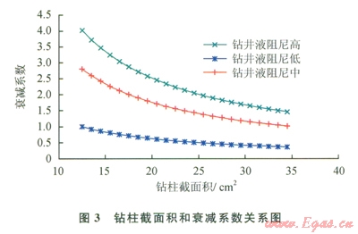 取鉆柱材料密度為7890kg/m3,聲速為5100m/s,頻率選用5000Hz,選擇3種黏滯系數(shù)分別為1×10-3kg/(m·s)、2.79×10-3kg/(m·s)和4×10-3kg/(m·s),在圖3中分別用鉆井液阻尼高、鉆井液阻尼中和鉆井液阻尼低來區(qū)分,截面積(Ap)變化范圍為l2.5~34.5cm2,由計(jì)算結(jié)果可知隨著截面積的增加,衰減系數(shù)呈現(xiàn)下降趨勢,黏滯系數(shù)的大小決定了截面積對衰減系數(shù)的影響程度。