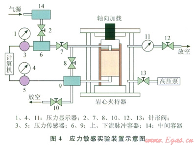 目前應(yīng)力敏感實(shí)驗(yàn)裝置如圖4所示,巖心徑向加圍壓方向與橡膠筒接觸,軸向上通過(guò)剛性柱塞加流體壓差[1,14-16]。