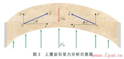 對(duì)上覆巖層進(jìn)行力學(xué)分析(圖2),上覆巖層可以通過(guò)巖石的本身抗彎、抗剪的內(nèi)力平衡巖石自身的重力,巖石的內(nèi)力可以分解為水平方向與垂直方向的力,垂向上的分力,巖石的重力Pv=ζsinθ=GR、巖石內(nèi)力以及下方的支撐力在垂向上滿足關(guān)系式: