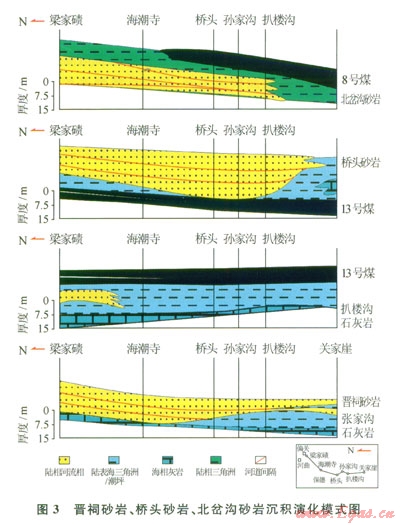 扒樓溝石灰?guī)r沉積時(shí)期的海侵之后,在濱海平原和潮坪環(huán)境的基礎(chǔ)上開始泥炭沼澤化沉積,聚煤場所隨著海水的后退而不斷拓展,形成厚層泥炭堆積,形成了太原組主力煤層l3號(hào)煤層,是整個(gè)河?xùn)|煤田穩(wěn)定發(fā)育的煤層。橋頭砂巖的展布范圍較晉祠砂巖略廣,在北部以河道沉積為主,在魏家灘以南,過渡為向上變粗層序,屬三角洲前緣砂,部分地段見分流河道砂[1]。
