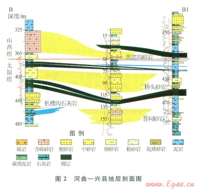 該區(qū)地層產(chǎn)狀平穩(wěn),構(gòu)造簡單(基本上為單斜構(gòu)造),呈近南北走向、西或西偏北方向傾斜,傾角5~10℃,區(qū)內(nèi)發(fā)育一些產(chǎn)狀平緩、規(guī)模不大的褶皺構(gòu)造[1,4]。地層由東向西,由老到新出露,在府谷地區(qū)以北,由于后期構(gòu)造和黃河下切作用,出露中奧陶統(tǒng)。上石炭統(tǒng)和下二疊統(tǒng)為區(qū)內(nèi)含煤地層,除偏關(guān)、河曲局部地段,從南到北均有分布。橋頭鎮(zhèn)地區(qū)以北,有幾組較大規(guī)模的斷裂構(gòu)造,使保德賈家峁一帶抬起,山西組及其以上地層缺失。