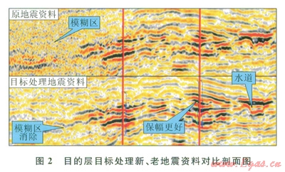 研究中消除這兩方面的影響岡素方法是:①開展地震資料目標(biāo)處理,提高地震資料的信噪比和目的層的資料相對(duì)保幅性(圖2);②改變常規(guī)反演只針對(duì)目的層段建模和反演的做法。本氣田反演從海底開始,嚴(yán)格利用所有淺層井資料開展包含淺層氣的建模,同時(shí)利用三維速度場(chǎng)資料來消除泥底辟區(qū)域的低速影響。通過精細(xì)目標(biāo)處理及速度約束補(bǔ)償反演,基本能夠消除淺層氣及泥底辟低速帶來的影響,儲(chǔ)層預(yù)測(cè)與深度預(yù)測(cè)與實(shí)鉆結(jié)果吻合較好。