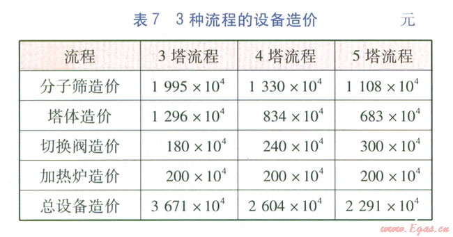 根據(jù)該項目的天然氣處理量及脫水脫硫醇負荷,對3塔、4塔、5塔流程進行設(shè)備造價估算。3種流程的設(shè)備設(shè)計參數(shù)見表6,設(shè)備造價見表7。