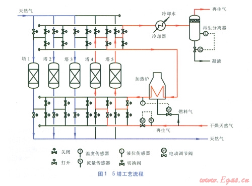 same molecular sieve bed tower.Taking the five towersfor example,the process flow for dehydration and mercaptan removal is introduced.The economy of thethree towers,four towers and five towers process flows is compared,and the economy of the five towers process flow is optimum.