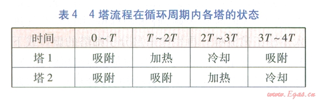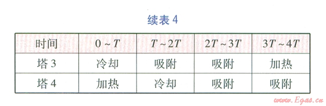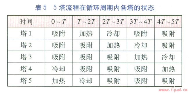 由5塔流程可知,再生氣先對已加熱再生分子篩塔進行冷卻,然后經(jīng)加熱爐升溫后對已完成吸附的分子篩塔進行加熱再生,這個過程是同時和連續(xù)的。當(dāng)對已加熱再生分子篩塔的冷卻完成后,才能進行分子篩塔的切換,我們將分子篩塔的冷卻或加熱再牛時間稱為切換周期r。將每座塔均被加熱再生、冷卻一次的時間稱為循環(huán)周期,例如對于3塔、4塔、5塔流程,循環(huán)周期分別為3T、4T、5 T。3塔、4塔、5塔流程在循環(huán)周期內(nèi)各塔的狀態(tài)分別見表3~5。