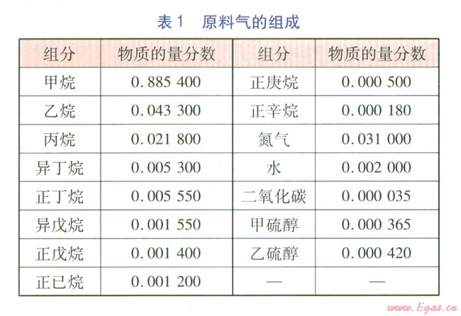 某大型天然氣液化廠的年處理量為260×104t/a,在預(yù)處理系統(tǒng)中,天然氣經(jīng)過油氣分離、計量后進人脫酸脫碳單元,脫除天然氣中的硫化氫、二氧化碳。從脫酸脫碳單元出來的天然氣(即脫水脫硫醇單元的原料氣)進入脫水脫硫醇單元,脫除其中的水、硫醇[1]。原料氣的工藝參數(shù)為:處理量:1000×104m3/d,壓力:6.3 MPa,溫度:45℃。原料氣的組成見表1。
