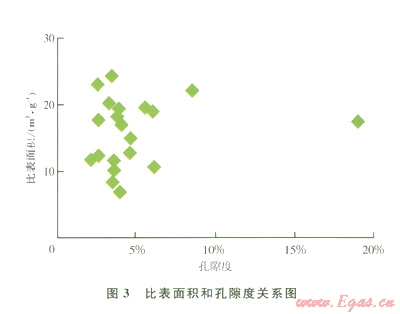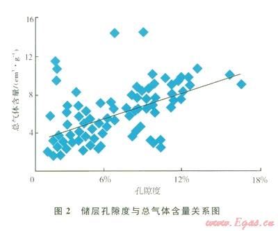 頁(yè)巖儲(chǔ)層為裂縫-孔隙結(jié)構(gòu),成巖作用過程中形成的裂縫和微孔是頁(yè)巖氣儲(chǔ)集空間和滲流通道。微孔對(duì)頁(yè)巖氣的儲(chǔ)存具有重要意義,一般而言,微孔體積越大,比表面積越大,對(duì)氣體吸附能力也就越強(qiáng)。國(guó)外測(cè)定的含氣頁(yè)巖巖心數(shù)據(jù)㈠表明,孔隙度與總氣體含量正相關(guān),受孔徑分布影響。圖2為國(guó)外實(shí)驗(yàn)室測(cè)定的頁(yè)巖孔隙度與含氣量關(guān)系。
