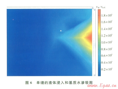 頁(yè)巖儲(chǔ)層中的微裂縫,是滲流的主要通道,在有效應(yīng)力作用下裂縫發(fā)生閉合,閉合后不易恢復(fù)原狀,即應(yīng)力損害具有不可逆性。頁(yè)巖儲(chǔ)層在原始條件下往往處于“亞束縛水”狀態(tài),被水基工作液正壓差打開后,水基液迅速浸入并充滿井眼周圍的裂縫網(wǎng)絡(luò),毛細(xì)管力作用將導(dǎo)致儲(chǔ)層強(qiáng)烈吸水并形成水相傷害層,頁(yè)巖氣被水相傷害帶封閉在孔隙基塊內(nèi),造成水鎖損害。此時(shí)儲(chǔ)層損害是應(yīng)力敏感性和水鎖損害的疊加。采用仿真軟件對(duì)液相浸入過程建模模擬,模型設(shè)定儲(chǔ)層單縫縫寬1 μm,考慮基質(zhì)和裂縫壓縮性,正壓差0.1 MPa。模擬計(jì)算結(jié)果(圖6)表明:水相在正壓差下浸入很快,占據(jù)裂縫僅需數(shù)秒,之后通過裂縫表面向基質(zhì)的滲流和水滲吸。隨時(shí)間延長(zhǎng),縫面滲透、吸水帶范圍擴(kuò)大,直至含水平衡飽和。
