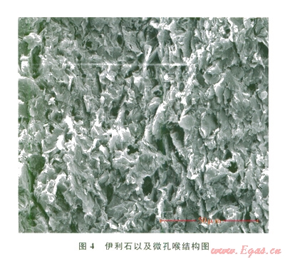 圖4、5是掃描電鏡觀測(cè)到的伊利石和綠泥石分布狀態(tài)。伊利石的吸附流體作用在TOC較低的頁(yè)巖中有很重要的影響。絨球狀綠泥石一般不具有膨脹性,只有在水鎂石八面體晶片酸蝕失玄了Mg2+、Fe3+的條件下才會(huì)導(dǎo)致水鎂石解體出現(xiàn)晶間膨脹。