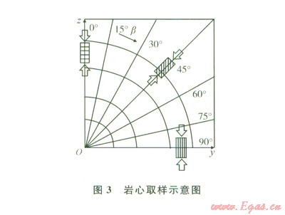 為探討層理頁巖的各向異性,按一定的β方向取樣(β角為層理而與巖樣端面問的夾角)。β角從0°~90°,每隔l5°取l個樣,共計(jì)7個樣(圖3)。巖樣上下端面的不平行度小于