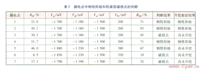 如果RIRC大于等于0.6,則可判斷此處金屬表面防腐層的電阻很小,預(yù)測為犧牲陽極;如果RIRC>1,則不排除此處管道上伴隨有防腐層破損情況;如果RIRC小于0.6,則表明此處金屬表面防腐層的絕緣電阻還比較大,可以判斷為防腐層破損。此處的0.6是一個經(jīng)驗性數(shù)值,按此判斷是否精準,還需要更多的實踐來證實。根據(jù)此方法,對7處漏電點的判斷結(jié)果見表2。