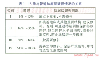 IR降越大,陰極保護程度越低,即埋地管道防腐層缺陷面積越大,可見DCVG能夠較準確地預(yù)測防腐層缺陷的面積,并能對整個管道的陰極保護效果做出客觀的判斷。IR降與防腐層破損情況的關(guān)系見表1。