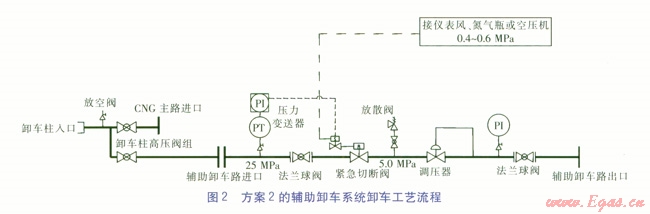 卸車柱入口到緊急切斷閥之間的管道設(shè)計(jì)壓力為25 MPa,緊急切斷閥之后的管道設(shè)計(jì)壓力為5.0 MPa。如果在卸車柱入口管道上安裝壓力變送器并在輔助卸車路進(jìn)口前增加緊急切斷閥,就會達(dá)到更加安全的效果。緊急切斷閥與壓力變送器連鎖,保證CNG氣瓶車內(nèi)壓力高于4.0 MPa時(shí),緊急切斷閥一直保持切斷狀態(tài),只有當(dāng)CNG氣瓶車內(nèi)壓力低于或等于4.0 MPa時(shí),緊急切斷閥才會開啟。這樣就達(dá)到了更高的安全級別,即便操作人員誤將輔助卸車路閥門當(dāng)成主路閥門開啟,仍不會使高于4.0 MPa的CNG進(jìn)入輔助卸車系統(tǒng)。工藝流程見圖3。