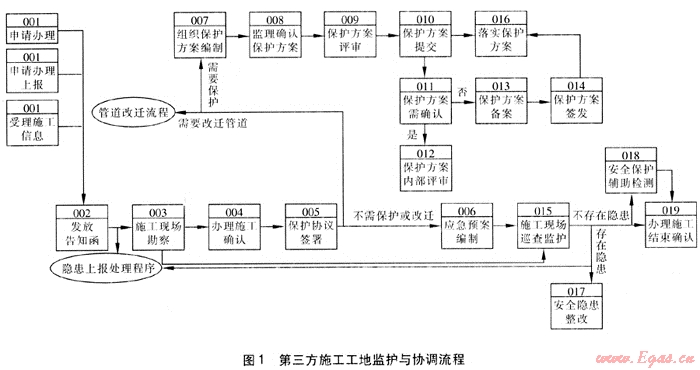 本流程包括第三方施工信息源的獲取、安全協(xié)調(diào)工作的開展、安全保護工作實施、安全保護措施的落實、安全協(xié)調(diào)保護過程的監(jiān)控等一系列工作。燃氣管道設施經(jīng)營管理單位參與的主要程序包括:巡查發(fā)現(xiàn)施工信息并上報、受理施工信息、發(fā)放告知函、施工現(xiàn)場勘察、辦理燃氣管道設施確認、簽訂保護協(xié)議、編制應急預案、保護方案內(nèi)部評審、保護方案備案、施工現(xiàn)場巡查監(jiān)護、安全保護檢測等。施工結束后,建立《施工工地安全保護協(xié)調(diào)檔案》。